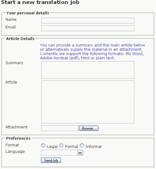 The scenario is a continuation from our last example. To fill you in or refresh your memory, we set up a job request form for a translation agency where clients can either type in an article into a text box or attach a text file. A second form in on the same page allowed existing clients to request a progress report, for which they needed a job number. In the example the translation agency would receive an email and would then have to assign a job number and follow up manually.